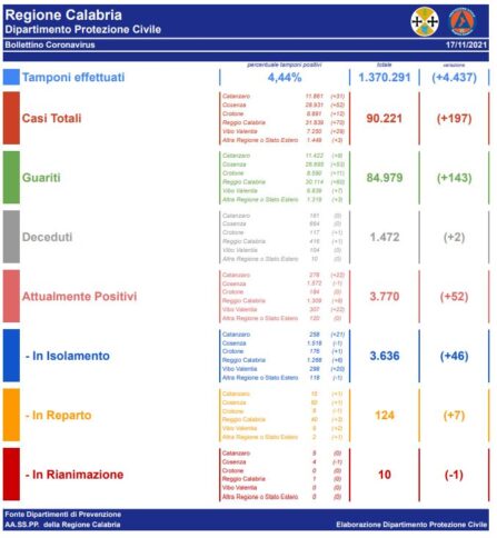 CATANZARO In Calabria, ad oggi, il totale dei tamponi eseguiti sono stati 1.370.291 (+4.437). Le persone risultate positive al Coronavirus sono 90.221 (+197) rispetto a ieri.