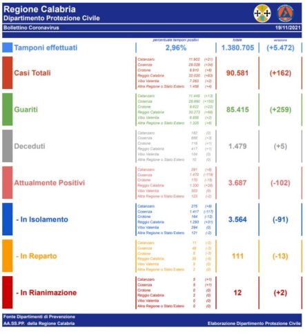 – Catanzaro: CASI ATTIVI 291 (11 in reparto, 5 in terapia intensiva, 275 in isolamento domiciliare); CASI CHIUSI 1.1611 (11.449 guariti, 162 deceduti).