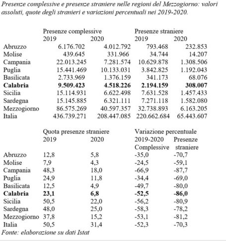 «Il motivo della scarsa presenza degli stranieri è dovuto al fatto che la regione viene di fatto bypassata: i clienti esteri si recano in Campania e in Sicilia saltando la Calabria. È una circostanza che riguarda anche altre regioni del Mezzogiorno continentale che non hanno eccellenze, cioè, anche Abruzzo, Molise, Basilicata e Puglia. Per comprendere la dimensione basta citare alcuni dati. Nel 2019, in Calabria solo il 23,1% delle presenze è dovuto agli stranieri a fronte del 50,5% riscontrabile come dato nazionale. Nel 2020, anno della Pandemia, la quota di presenze straniere nella regione è stato solo del 6,8% a fronte del 31,4% a livello nazionale. Numeri quelli legati al flusso di turisti stranieri distanti anche dalle altre regioni del Sud. In Abruzzo la quota di presenze straniere è stata del 12,8% nel 2019 e del 5,8% nel 2020, in Molise le rispettive quote sono state del 7,9% e il 4,3%. Mentre in Puglia la percentuale per il 2019 è stata pari al 24,9% e dell’11,8% l’anno scorso ed infine in Basilicata i due dati sono stati pari al 12,5% ed il 4,9%. Più in linea con quanto si verifica per le regioni del Centro Nord è l’andamento delle altre regioni del Sud, Campania, Sicilia e Sardegna: in Campania la quota di presenze straniere su quelle totali presenti è del 48,3% nel 2019 e del 18,0% nell’anno successivo, in Sicilia le rispettive quote sono il 50,5% ed il 22,0%. in Sardegna il 51,0% ed il 25,0».