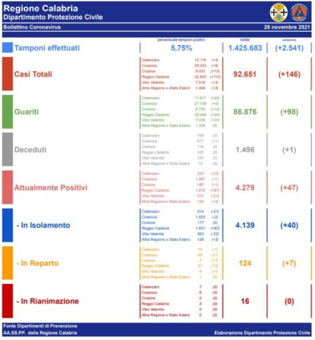 – Reggio Calabria: CASI ATTIVI 1.675 (41 in reparto, 3 in terapia intensiva, 1.631 in isolamento domiciliare); CASI CHIUSI 31.268 (30.848 guariti, 420 deceduti).
