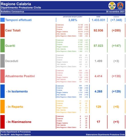 – Reggio Calabria: CASI ATTIVI 1.759 (43 in reparto, 3 in terapia intensiva, 1.713 in isolamento domiciliare); CASI CHIUSI 31.311 (30.891 guariti, 420 deceduti).