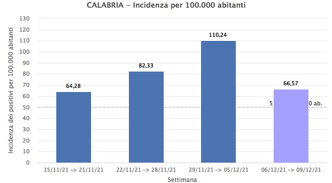 Il rischio che la Calabria finisca in zona gialla è davvero molto concreto. Alla vigilia del monitoraggio della Cabina di Regia e dell’Istituto superiore di sanità ai fini dell’attribuzione del colore alle Regioni, monitoraggio che si basa sui dati del giovedì, la Calabria purtroppo registra tutti i paramenti da zona gialla, nel senso che ad oggi la Calabria ha contestualmente superato le tre soglie critiche dell’incidenza dei positivi per 100mila abitanti e dei ricoveri in area media e in terapia intensiva. Secondo la rilevazione di Agenas aggiornata a questa sera, infatti, la Calabria presenta un’incidenza, tra il 6 e il 9 dicembre, del 66,57, superiore alla soglia del 50. Quanto all’occupazione dei posti letto negli ospedali a causa del Covid 19, l’Agenas registra in Calabria l’11% nelle terapie intensive (a fronte di una soglia critica del 10%) e il 17% nell’area medica (a fronte della soglia critica del 15%). C’è dunque attesa per il monitoraggio delle istituzioni sanitarie nazionali in programma domani.