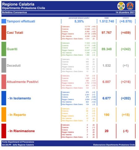 CATANZARO Nelle ultime 24 ore in Calabria si sono registrati 459 nuovi casi e un decesso da Coronavirus. Si segnalano 15 pazienti in più nei reparti e uno in meno nelle terapie intensive. Sono 242 le persone che risultano guarite o dimesse in un giorno. Così attualmente sono 6.887 i casi attivi di infezione di cui 6.677 si trovano in isolamento domiciliare, 190 ricoverati in reparto e 20 in terapia intensiva. Ed il tasso di positività registrato sale al 5,35%