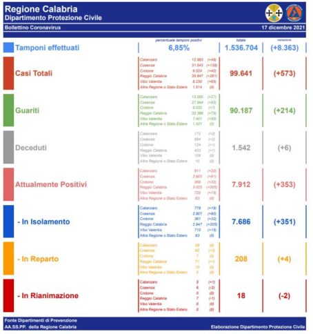 CATANZARO In Calabria, ad oggi, il totale dei tamponi eseguiti sono stati 1.536.704 (+8.363). Le persone risultate positive al Coronavirus sono 99.641 (+573) rispetto a ieri. Questi sono i dati giornalieri relativi all’epidemia da Covid-19 comunicati dai Dipartimenti di Prevenzione delle Asp della Regione Calabria.