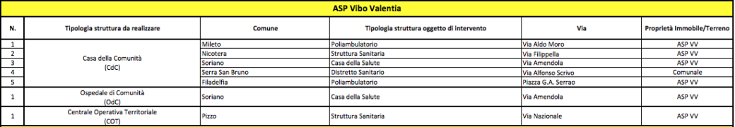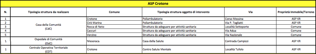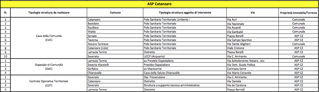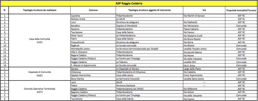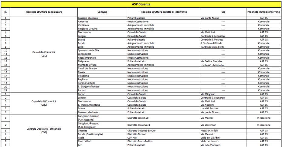 Negli schemi predisposti dalla struttura commissariale guidata da Occhiuto sono elencati tutti i presìdi in via di costituzione in Calabria. Alcuni saranno ospitati in strutture già esistenti, altri sono di nuova realizzazione. Di seguito l’elenco predisposto per le cinque province.