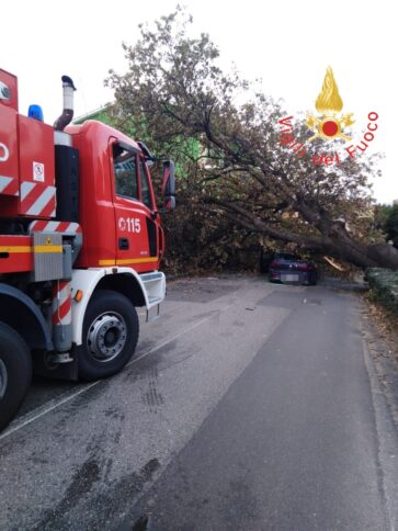 Un grosso albero d’alto fusto si è abbattuto sulla sede stradale schiacciando una autovettura Volkswagen Golf in transito. A bordo della vettura il solo conducente, un giovane, che ha riportato qualche lieve escoriazione ed è stato affidato al personale sanitario del Suem118 per le cure del caso.