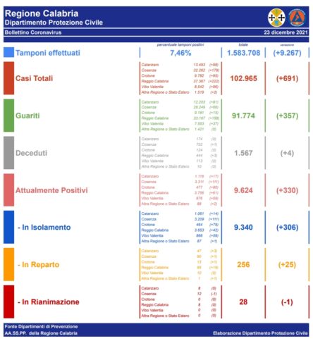 CATANZARO In Calabria, ad oggi, il totale dei tamponi eseguiti sono stati 1583708 (+9.267). Le persone risultate positive al Coronavirus sono 102965 (+691) rispetto a ieri. Questi sono i dati giornalieri relativi all’epidemia da Covid-19 comunicati dai Dipartimenti di Prevenzione delle AA.SS.PP. della Regione Calabria.