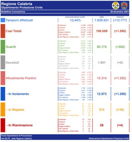 CATANZARO In Calabria, ad oggi, il totale dei tamponi eseguiti sono stati 1.639.521 (+12.777). Le persone risultate positive al Coronavirus sono 108.089 (+1.590) rispetto a ieri. Questi sono i dati giornalieri relativi all’epidemia da Covid-19 comunicati dai Dipartimenti di Prevenzione delle Asp della Regione Calabria.