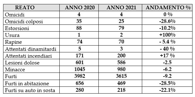L’andamento dei reati nel territorio registra, ad invarianza del numero degli omicidi dolosi/femminicidi, un sostanziale ulteriore decremento rispetto all’anno precedente in ordine agli omicidi colposi, ai reati predatori, alle lesioni dolose ed alle minacce. In ordine agli attentati dinamitardi ed a quelli incendiari si è registrato un sensibile decremento dei primi a fronte di un significativo incremento dei secondi.