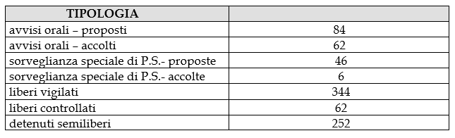 Se l’andamento complessivo dell’attività di contrasto alla criminalità registra un trend positivo in relazione anche alla diminuzione dei reati, appare comunque significativa l’azione propositiva dell’Arma sul fronte delle misure di prevenzione e dei controlli sulle persone libere vigilate o controllate e sui detenuti semiliberi».
