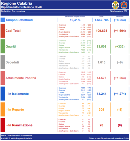 CATANZARO In Calabria, ad oggi, in totale, i tamponi eseguiti sono stati 1.647.785 (+8.263). Le persone risultate positive al Coronavirus sono 109.693: +1.604 rispetto a ieri. Questi sono i dati giornalieri relativi all’epidemia da Covid-19 comunicati dai Dipartimenti di Prevenzione delle Asp della Regione Calabria. Sono 9 le vittime nelle ultime 24 ore, mentre diminuscono (-8) le persone ricoverate nei reparti ordinari. Stabili i pazienti nelle Terapie intensive della Regione. Quota record anche per i soggetti attualmente positivi: sono più di 14.500.