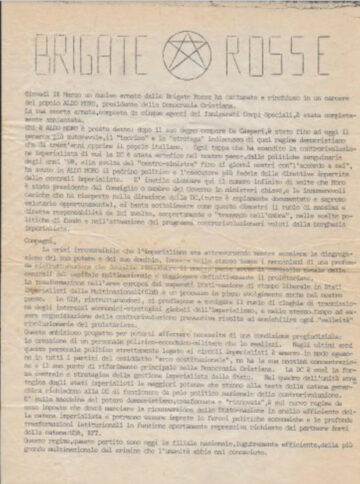 Uno dei documenti più drammatici della storia italiana del dopoguerra, il comunicato con il quale le Brigate Rosse rivendicarono il sequestro dell’allora presidente della Dc, Aldo Moro e il massacro della sua scorta, finisce all’incanto in una asta online.