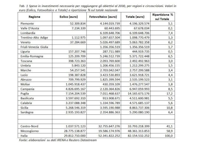 Stando alla ricerca sarebbe necessario destinare 82 miliardi di investimenti, complessivamente dedicati in Italia per rilanciare la creazione di una rete basata sulle Fonti di energie rinnovabili, per generare un incremento del valore della produzione di 148 miliardi di euro con orizzonte temporale al 2030. In pratica, stimano gli analisti della Svimez, per ogni euro investito se ne creerebbero 1,8 nell’intero sistema economico con un valore aggiunto addizionale pari a 55 miliardi di euro. Con un impatto in termini di incidenza del valore aggiunto attivato sul Pil, nel lasso di tempo ipotizzato dalla ricerca (2030) pari al +3,1% sul 2019 a livello nazionale.
