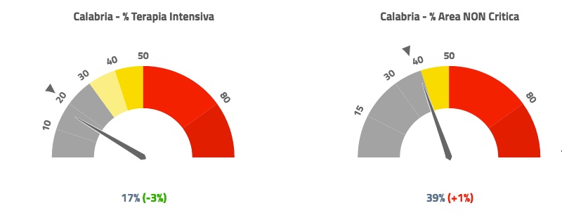 Continua a crescere l’occupazione di posti letto in area medica, mentre invece cala il numero dei ricoveri in terapia intensiva e questo potrebbe far evitare il passaggio della Calabria in zona arancione. È quanto emerge dalla lettura dell’ultima rilevazione dell’Agenas sul tasso di ospedalizzazione da Covid 19 in Calabria: secondo il monitoraggio dell’Agenzia aggiornato a ieri sera, infatti, in area medica l’occupazione dei pl negli ospedali calabresi è al 39% (+1 rispetto al giorno precedente e più 12 rispetto alla media nazionale) sempre abbondantemente sopra la soglia di allerta (30%), mentre invece l’occupazione delle terapie intensive è scesa dal 20 (che è la soglia di allerta) al 17% (anche se per alcuni decessi). In generale, in base ai dati del bollettino della Regione, a oggi i ricoveri in Calabria sono complessivamente 432, di questi 33 in terapia intensiva.