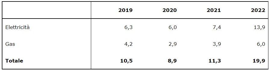 Tabella: spesa energia settore commercio, alloggi, ristorazione