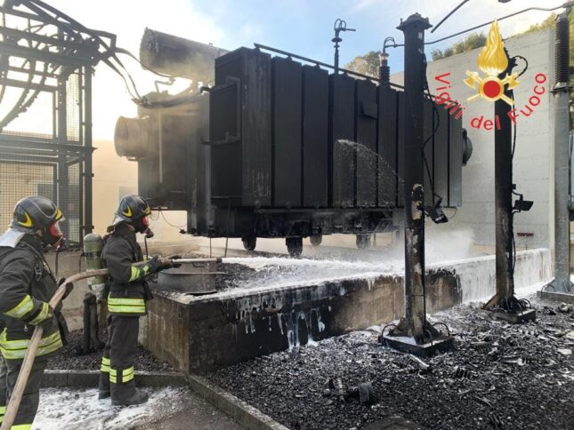 A causa dell’alta tensione che attraversa la linea elettrica alimentando l’impianto in questione, circa 150.000 V, l’olio caduto nella vasca si è incendiato, provocando il surriscaldamento della contenitore e fumo denso.