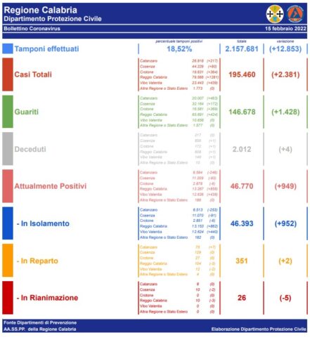 CATANZARO In Calabria, ad oggi, il totale dei tamponi eseguiti sono stati 2.157.681 (+12.853). Le persone risultate positive al Coronavirus sono 195.460 (+2.381) rispetto a ieri. Questi sono i dati giornalieri relativi all’epidemia da Covid-19 comunicati dai Dipartimenti di Prevenzione delle AA.SS.PP. della Regione Calabria.