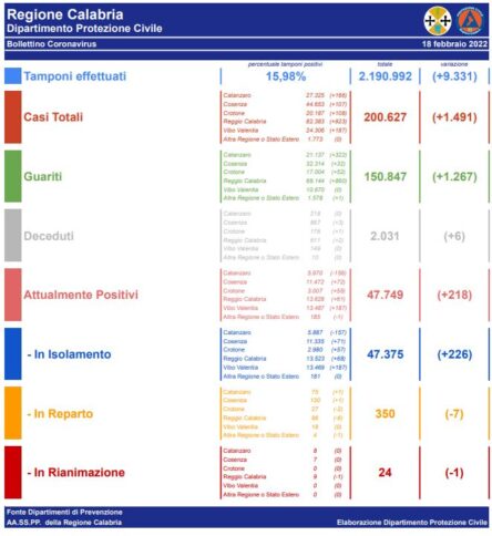 CATANZARO Nelle ultime 24 ore in Calabria si sono registrati 1.491 nuovi casi e 6 decessi da Coronavirus. Si segnalano sette pazienti in meno nei reparti ed uno nelle terapie intensive. Sono 1.267 le persone che risultano guarite o dimesse in un giorno. Così attualmente sono 47.749 i casi attivi di infezione di cui 47.375 si trovano in isolamento domiciliare, 350 ricoverati in reparto e 24 in terapia intensiva. Il tasso di positività ora è pari al 15,98%.