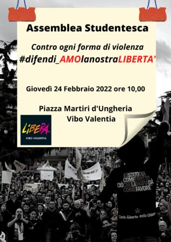 Vogliamo che vengano ascoltati e vogliamo ascoltarli, pertanto, abbiamo indetto per giovedì 24 febbraio alle ore 10,00, in piazza Martiri d’Ungheria a Vibo Valentia l’assemblea studentesca “Contro ogni forma di violenza, #difendi_AMOlanostraLIBERTA’”. Un’iniziativa costruita con tutti i rappresentanti delle scuole che a loro volta l’hanno condivisa con i loro dirigenti scolastici per consentire la maggiore partecipazione possibile.