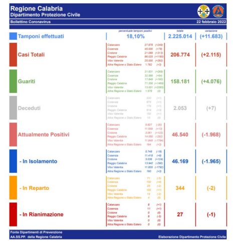 CATANZARO Nelle ultime 24 ore in Calabria si sono registrati 2.115 nuovi casi e 7 decessi da Coronavirus. Si segnalano due pazienti in meno nei reparti e uno nelle terapie intensive. Sono 4.076 le persone che risultano guarite o dimesse in un giorno. Così attualmente sono 46.540 i casi attivi di infezione di cui 46.169 si trovano in isolamento domiciliare, 344 ricoverati in reparto e 27 in terapia intensiva. Il tasso di positività ora è pari al 18,1%.