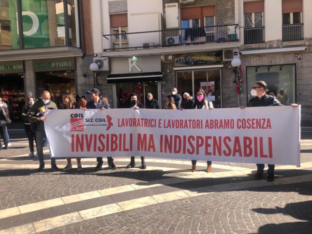 COSENZA Partita la protesta dei lavoratori dell’Abramo Customer Care annunciata per oggi. Questa mattina sono iniziati i presidi davanti alle prefetture di Catanzaro, Cosenza e Crotone e davanti alla sede aziendale di San Floro, sit in appoggiati dai sindacati Cgl Cisl e Uil che puntano a far sentire la voce dei lavoratori e ad avere delle risposte immediate.