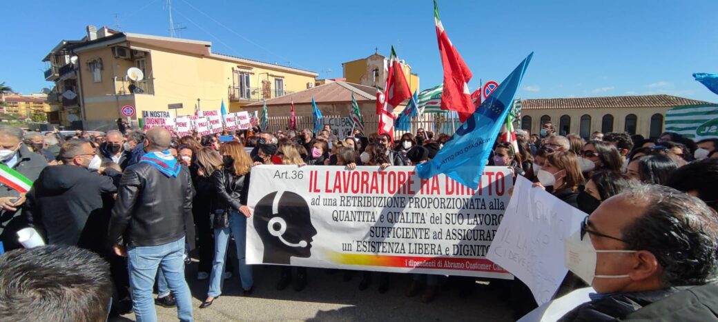 Diverse centinaia di persone stanno protestando davanti alla sede della Prefettura di Crotone, in contemporanea con le analoghe proteste in corso davanti alle Prefetture di Catanzaro e Cosenza, per chiedere una soluzione alla crisi che sta interessando, ormai da diversi mesi, l’azienda Abramo Customer Care dove sono a rischio oltre 1.500 posti di lavoro nel settore dei call center, mille dei quali sono a Crotone. Nel piazzale dell’ufficio territoriale del governo, oltre ai dipendenti dell’azienda, sono arrivati studenti delle scuole superiori e semplici cittadini per manifestare il loro sostegno ai lavoratori che rappresentano un importante pezzo di economia per l’intera provincia: circa tre milioni di euro al mese di salari che verrebbero a mancare al territorio. Anche per questo la risposta della città è stata corale: da questa mattina gli esercizi commerciali hanno abbassato le loro serrande sulle quali sono comparsi cartelli con la scritta «solidarietà ai lavoratori Abramo» o anche «chiuso per Abramo». Il prefetto di Crotone, Maria Carolina Ippolito, ha ricevuto una delegazione composta dai rappresentanti delle organizzazioni sindacali provinciali e regionali, dal sindaco di Crotone Vincenzo Voce, dal presidente della Provincia Sergio Ferrari, dalla deputata del M5s Elisabetta Barbuto. La riunione e’ ancora in corso «Siamo qui, lap e dipendenti della Abramo Customer Care – ripetono sul piazzale i lavoratori – per chiedere un futuro occupazionale, una regolarità contributiva. Abbiamo continuato a lavorare nonostante non prendessimo stipendi garantendo la sopravvivenza dell’azienda. Difendere il lavoro in questa azienda e’ importante per noi e per tutta la città perché una crisi del genere può avere un impatto devastante a livello economico e sociale».
