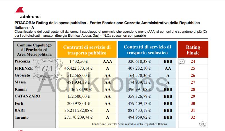 A loro va la tripla AAA, il massimo rating attribuito dalla rilevazione e che mantengono per entrambe le voci di spesa, quella per i contratti di servizio di trasporto pubblico e quella per contratti di servizio di trasporto scolastico.