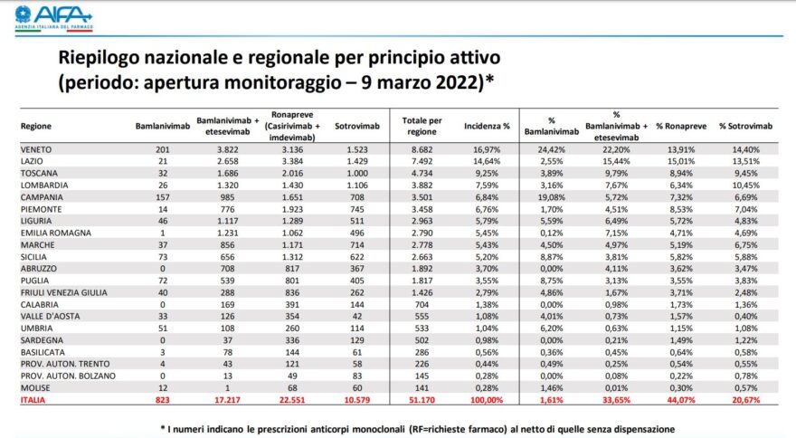 Entrati ufficialmente a far parte delle terapie anti Covid il 9 marzo scorso, ma somministrati ai pazienti a partire dal 18 marzo, gli anticorpi monoclonali sono stati prescritti, in Italia, a 51.170 pazienti in poco meno di 12 mesi, di cui ben il 17% in Veneto. Mentre quella percentuale si riduce per la Calabria ad appena l’1,38%.