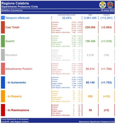 – Reggio Calabria: CASI ATTIVI 12.821 (128 in reparto, 8 in terapia intensiva, 12.685 in isolamento domiciliare); CASI CHIUSI 93630 (92966 guariti, 664 deceduti).