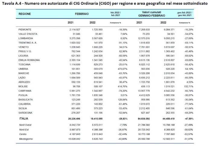 Per quanto attiene la cassa integrazione ordinaria a febbraio 2022, le ore autorizzate in Calabria sono state 143.002 contro le 371.220 dell’anno precedente con una flessione dunque del 61,48%. Se poi confrontato al bimestre gennaio-febbraio, il dato di decrescita del ricorso alla Cigo è ancora più marcato: -77,54%. Decisamente al di sopra della media nazionale ferma a -47,59% in questo periodo.