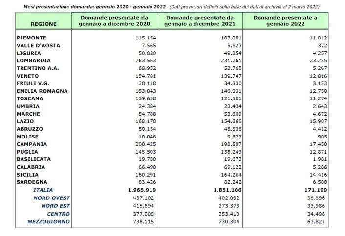 Diversa la situazione sulle domande per accedere al Naspi, prestazione economica che sostituisce l’indennità di disoccupazione. Qui il dato registra una crescita. Nel confronto gennaio-dicembre 2020 rispetto ai dodici mesi successivi, le domande presentate sono cresciute. In particolare due anni fa le domande sono state 66.490 mentre lo scorso anno si sono registrate 69.122 richieste. Con un dato che in termini percentuali, si traduce in circa 4 punti in più (3,96%). Un dato in controtendenza su base nazionale che viceversa registra un minore ricorso al meccanismo ex indennità di disoccupazione.