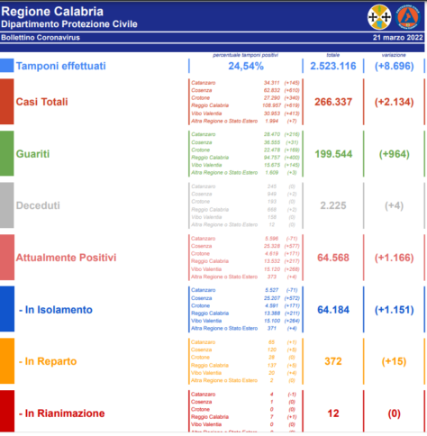 – Reggio Calabria: CASI ATTIVI 13.532 (137 in reparto, 7 in terapia intensiva, 13.388 in isolamento domiciliare); CASI CHIUSI 95.425 (94.757 guariti, 668 deceduti).