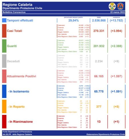 – Reggio Calabria: CASI ATTIVI 13.530 (134 in reparto, 6 in terapia intensiva, 13.390 in isolamento domiciliare); CASI CHIUSI 96.424 (95.752 guariti, 672 deceduti).