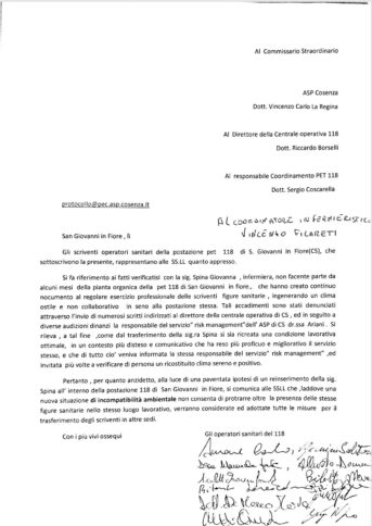 Ma esistono vicende di segno opposto, come quella della postazione del 118 di San Giovanni in Fiore, che abbiamo raccontato di recente sul Corriere della Calabria e poi ha avuto ulteriori sviluppi. Poco prima del rientro definitivo della dipendente, che si chiama Giovanna Spina, alcuni suoi colleghi di postazione avevano scritto ai vertici dell’Asp di Cosenza una lettera, di cui abbiamo verificato l’autenticità, sostenendo che in assenza dell’infermiera si era «ricreata una condizione lavorativa ottimale, in un contesto più disteso e comunicativo» e anticipando che, «alla luce di una paventata ipotesi di un reinserimento della sig. Spina all’interno della postazione 118 di San Giovanni in Fiore, si comunica alle SSLL che laddove una nuova situazione di incompatibilità ambientale non consenta di protrarre oltre la presenza delle stesse figure sanitarie nello stesso luogo lavorativo, verranno considerate ed adottate tutte le misure per il trasferimento degli scriventi in altre sedi».