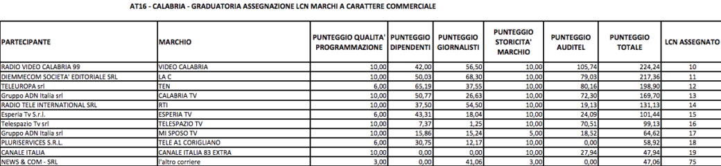 Per definire la graduatoria per le emittenti locali, dunque, ci sono due passaggi fondamentali. Quello preliminare è l’acquisizione dell’idoneità. Si basa su diversi criteri: i dipendenti assunti, i dati Auditel (indici d’ascolto), gli investimenti sostenuti. È necessario superare questa prima selezione per accedere alla seconda, che assegna la nuova numerazione. Al termine di questo primo round, L’altro Corriere si piazza al decimo posto fra gli idonei con 201,38 punti. Al tredicesimo posto c’è “Canale Italia 83 Extra”, che totalizza 79,26 punti ottenuti esclusivamente grazie ai dati Auditel. Non potrebbe essere diversamente: “Canale Italia 83 Extra” non dichiara dipendenti in Calabria (e d’altra parte non potrebbe, oltretutto non ha una sede sul territorio regionale) né dichiara di aver sostenuto costi d’investimento. In realtà appare anomala anche la segnalazione del punteggio ottenuto con i dati Auditel. La questione è sia di forma che di sostanza: “Canale Italia 83 Extra” non è nei report Auditel, ma questo aspetto della faccenda diventa di fondamentale importanza più avanti, quando si passa al secondo bando e alla definizione della graduatoria finale per assegnare la nuova numerazione dei canali. Qui siamo, ancora, all’attestazione di idoneità (che comunque non dovrebbe esserci, vista l’assenza del marchio dai report Auditel).