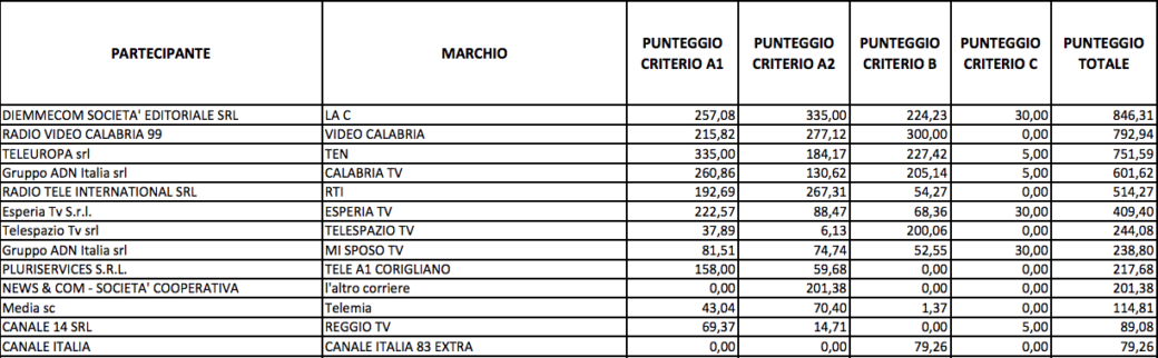 Il “ribaltone” del secondo bando: “Canale Italia 83 Extra” al decimo posto