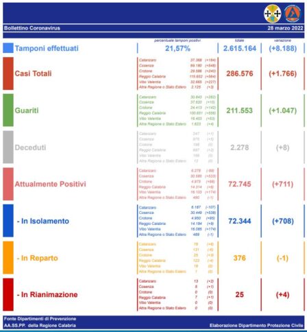 CATANZARO In Calabria, ad oggi, il totale dei tamponi eseguiti sono stati 2.615.164 (+8.188). Le persone risultate positive al Coronavirus sono 286.576 (+1.766) rispetto a ieri. Questi sono i dati giornalieri relativi all’epidemia da Covid-19 comunicati dai Dipartimenti di Prevenzione delle Azienda sanitarie provinciali della Regione Calabria.