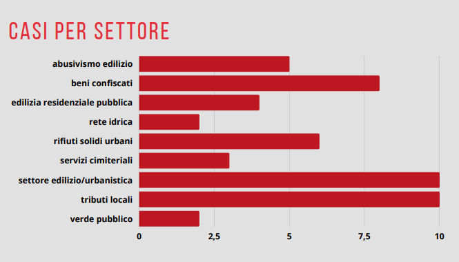 Le mafie riservano le loro attenzioni ad alcuni settori più di altri «a seconda delle occasioni di arricchimento e di riciclaggio del denaro». Al primo posto spiccano il settore edilizio-urbanistico e quello dei tributi locali (con 10 casi ciascuno) seguiti a ruota da quello dei beni confiscati e dei rifiuti rispettivamente con 8 e 6 casi.