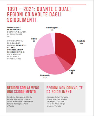Sono passati trent’anni e i decreti di scioglimento sono stati in tutto 365, per un totale di 275 Enti sciolti almeno una volta (di cui 6 aziende ospedaliere e sanitarie). La Calabria è al primo posto con 127 scioglimenti. A tre cifre segue la sola Campania con 113. Ventotto, invece, sono invece gli Enti colpiti da plurimi decreti di scioglimento in Calabria (27 in Campania e 15 in Sicilia).