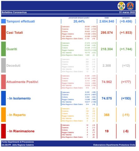 – Reggio Calabria: CASI ATTIVI 13.214 (114 in reparto, 4 in terapia intensiva, 13.096 in isolamento domiciliare); CASI CHIUSI 105.374 (104.673 guariti, 701 deceduti).