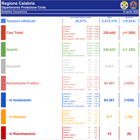– Reggio Calabria: CASI ATTIVI 13.123 (98 in reparto, 1 in terapia intensiva, 13.024 in isolamento domiciliare); CASI CHIUSI 115.744 (115.011 guariti, 733 deceduti).
