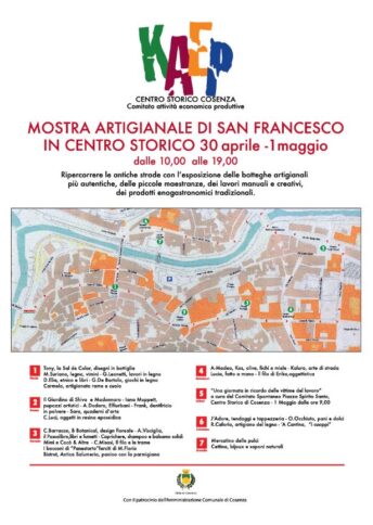 COSENZA La “Mostra artigianale di San Francesco“ si svolgerà dal 30 aprile al primo maggio, dalle 10 alle 19, lungo tutto il centro storico di Cosenza. L’idea è quella di riportare, in scala ridotta, l’antica manifestazione artigiana di San Francesco nel centro storico di Cosenza. Non a caso la scelta dei giorni indicati ricadono nella devozione del Santo degli ultimi. Il motivo di questa festa è molto antico, risale infatti all’evento della canonizzazione di Francesco di Paola avvenuta il 1 maggio 1519, ad opera del Papa Leone X con la bolla Excelsus Domini. Come nella città di Paola, ai festeggiamenti religiosi, si affianca un programma civile caratterizzato da esposizione artigiane, concerti, spettacoli pirotecnici. Lo scopo principale di questa manifestazione è essenzialmente culturale: rivitalizzare e far conoscere quanto più possibile il centro storico di Cosenza, mettendo in risalto le sue peculiarità artistiche ed artigianali proprio attraverso gli artigiani eccellenti che già hanno bottega e la loro attività nel centro storico. A questi si affiancheranno artisti ed artigiani/ambulanti che, nei due giorni della piccola fiera, esporranno le loro creazioni artistiche ed i loro prodotti.