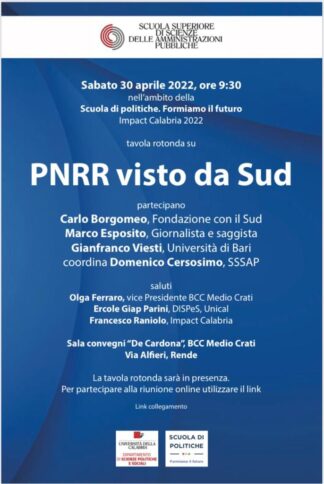 RENDE Il Pnrr è davvero la “grande occasione” per riparare i danni sociali ed economici della pandemia e per ridurre il divario civile e produttivo tra Nord e Sud? 230 miliardi di spesa pubblica, di cui più di 82 destinati al Mezzogiorno, da investire entro il 2026, a cui si aggiungeranno altre decine di miliardi derivanti dai bilanci ordinari e dalle politiche europee, saranno in grado di conseguire il superamento delle disuguaglianze territoriali e sociali? La spesa pubblica in sé, come è noto, è soltanto una delle condizioni abilitanti dei processi di trasformazione. Altri fattori sono altrettanto importanti per sostenere cambiamenti duraturi. Per curare e cambiare un Paese non basta la sola spesa pubblica, c’è bisogno di una visione, di un disegno condiviso di cambiamento possibile, di mete mobilitanti, di raccolta di conoscenze, bisogni e “sogni” diffusi. Tanto più quando un Paese, come l’Italia, è allo stesso tempo estremamente variegato e afflitto da storiche e severe fratture sociali e territoriali. Nel Pnrr non ci sono tracce esplicite di un progetto di cambiamento “attivo” del Mezzogiorno né si individuano gli attori per costruirlo e una strategia coordinata tra soggetti e interventi. Il rischio è che, come in altre occasioni, anche nel caso del Pnrr a dominare saranno le sollecitazioni esterne connesse alle risorse finanziarie del Piano, la spontaneità e la puntiformità dei mutamenti legati ai singoli investimenti, la bassa o nulla unitarietà strategica degli investimenti. Sarà in grado il PNRR di attivare nel Sud processi di innovazione economica, istituzionale, amministrativa, progettuale e gestionale tali da cambiare nel giro di pochi anni il volto socio-economico e civile della società meridionale? Saranno in grado i Comuni e le amministrazioni locali del Sud di cogliere le opportunità finanziarie del Piano? Cosa è ancora possibile fare per far sì che il PNRR da occasione si trasformi in una leva effettiva di cambiamento e trasformazione degli assetti civili e produttivi del Mezzogiorno? Sono questi gli interrogativi che animeranno la tavola rotonda su il “PNRR visto da Sud” organizzata dalla Scuola superiore di scienze delle amministrazioni pubbliche dell’Università della Calabria, nell’ambito della terza edizione della Scuola di politiche – Contact Calabria curata dal Dipartimento di scienze politiche e sociali e che vedrà la partecipazione di autorevoli studiosi e osservatori come Carlo Borgomeo (Fondazione con il Sud), Marco Esposito (Giornalista de Il Mattino) e Gianfranco Viesti (Università di Bari).