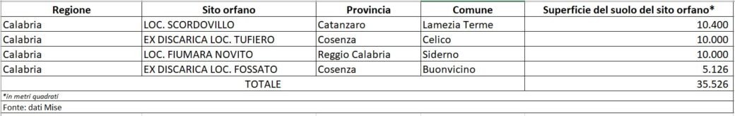 Ed in Calabria, come detto, sono quattro i siti orfani individuati dal Ministero della Transizione ecologica che potranno beneficiare degli interventi di bonifica. Due nella provincia di Cosenza, uno nel Reggino e infine un altro nel Catanzarese.