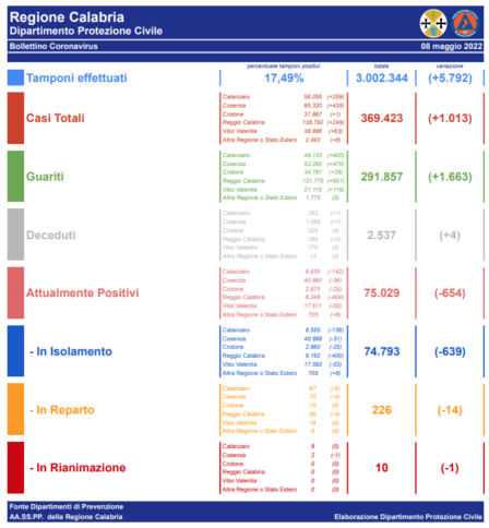 In Calabria, ad oggi, il totale dei tamponi eseguiti sono stati 3002344 (+5.792 nelle ultime 24 ore). Le persone risultate positive al Coronavirus sono 369423 (+1.013 rispetto a ieri).