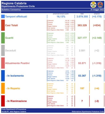 CATANZARO In Calabria, ad oggi, il totale dei tamponi eseguiti sono stati 3.079.355 (+5.170). Le persone risultate positive al Coronavirus sono 383.329 (+834) rispetto a ieri. Questi sono i dati giornalieri relativi all’epidemia da Covid-19 comunicati dai Dipartimenti di Prevenzione delle Asp della Regione Calabria.