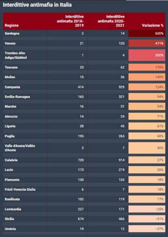 E c’è poi il dato ancor più strettamente collegato alle attività della mala costituito dall’interdittiva antimafia. Nei due anni di pandemia i provvedimenti emessi in Calabria hanno raggiunto la quota mostre di 914 interdittive: seconda regione per numero dopo la Campania (929). Con una crescita del 27% rispetto al biennio precedente. Segnale chiaro dell’infiltrazione della ‘ndrangheta nel tessuto produttivo calabrese. Un indicatore su cui la Calabria ha sempre “brillato”.