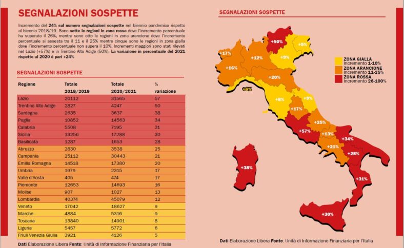 I dati che si riscontrano dagli oltre due anni di emergenza covid, fanno emergere come le cosche abbiano saputo approfittare della situazione. Disvelando come quel rischio di allargamento del controllo mafioso dell’economia locale sia tutt’altro che remoto. La crescita esponenziale dei cosiddetti “reati spia” ne è la comprova. Nel biennio 2020-2021 le segnalazioni sospette, ci dicono i dati forniti da Libera, hanno raggiunto oltre 252mila casi. Con un’impennata rispetto ai due anni precedenti – che corrispondono al periodo pre-pandemico – del 24%. Così come sono cresciute di molto le interdittive antimafia emesse nello stesso lasso di tempo interessato dalla fase più acuta dell’epidemia. Tra gennaio 2020 e ottobre scorso, sono stati 3.919 i provvedimenti emessi in Italia: un terzo esatto in più, del biennio precedente.