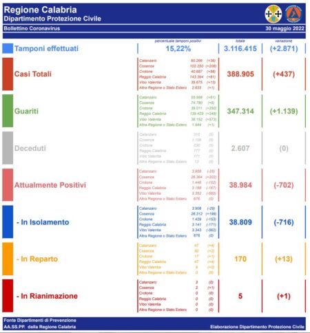 CATANZARO Non ci sono state vittime da Covid in Calabria nelle ultime 24 ore. È la prima volta dopo mesi che ciò avviene. Il totale dei decessi da inizio pandemia e’ di 2.607. I nuovi contagi sono 437 con un tasso di positività del 15,22% (ieri 15,29%). Tornano a crescere – nel saldo tra ingressi ed uscite – i ricoverati: +13 in area medica (170) e +1 in terapia intensiva (5). I nuovi guariti sono 1.139, i casi attivi 38.984 (-702) e gli isolati a domicilio 38.809 (-716). I dati sono comunicati dai Dipartimenti di Prevenzione delle Asp della Regione Calabria. Ad oggi il totale dei tamponi eseguiti è di 3.116.415 con 388.905 positivi. In Calabria, ad oggi, il totale dei tamponi eseguiti sono stati 3.116.415 (+2.871).