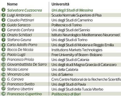 Tra i migliori 20 italiani figurano Salvatore Cuzzocrea (Messina), Claudio Pettinari (Universita’ di Camerino), Gerardo Canfora (Università del Sannio), Giovambattista De Sarro (Universita’ Magna Grecia di Catanzaro), Nicola Leone (Universita’ della Calabria), Vincenzo Loia (Università di Salerno), Francesco Cupertino (Politecnico di Bari) e Matteo Lorito (Università Federico II di Napoli).
